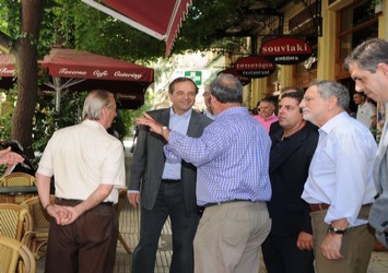 Λίγο μετά, παίρνοντας τον καφέ του σε ζαχαροπλαστείο της περιοχής, συνοδευόμενος από τον υπουργό Δημόσιας Τάξης Νίκο Δένδια, ζητά ενίσχυση των προσπαθειών για μια ασφαλή Αθήνα.